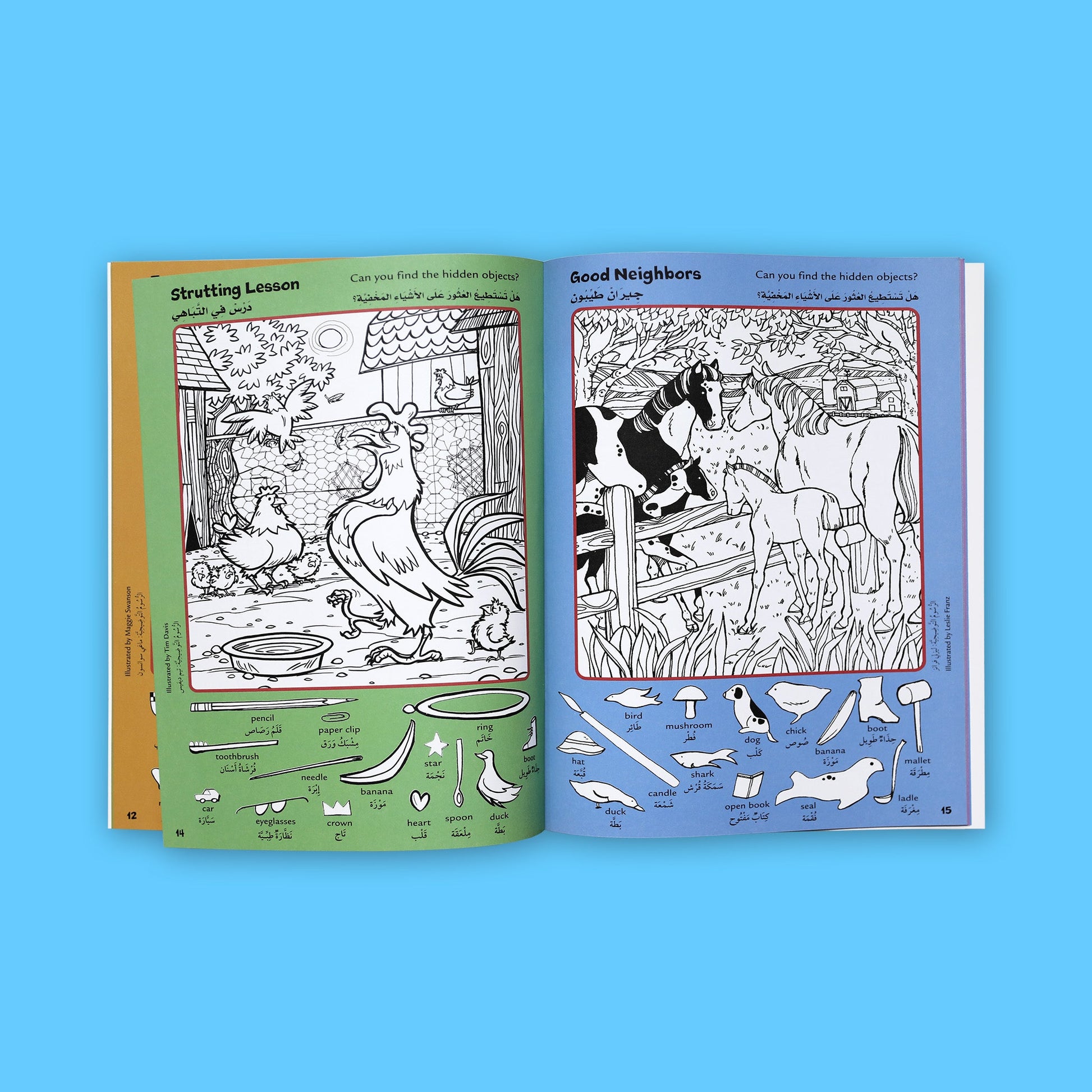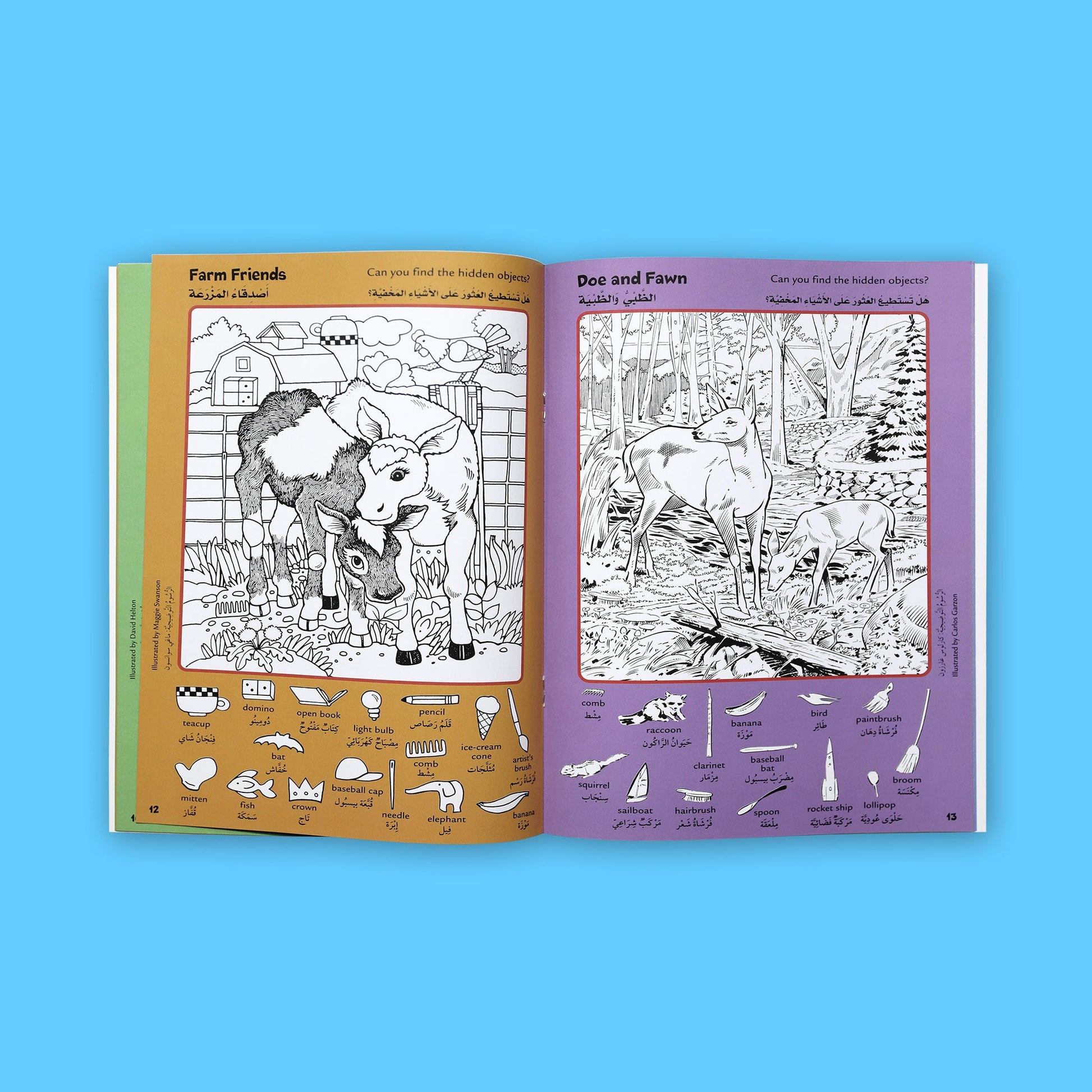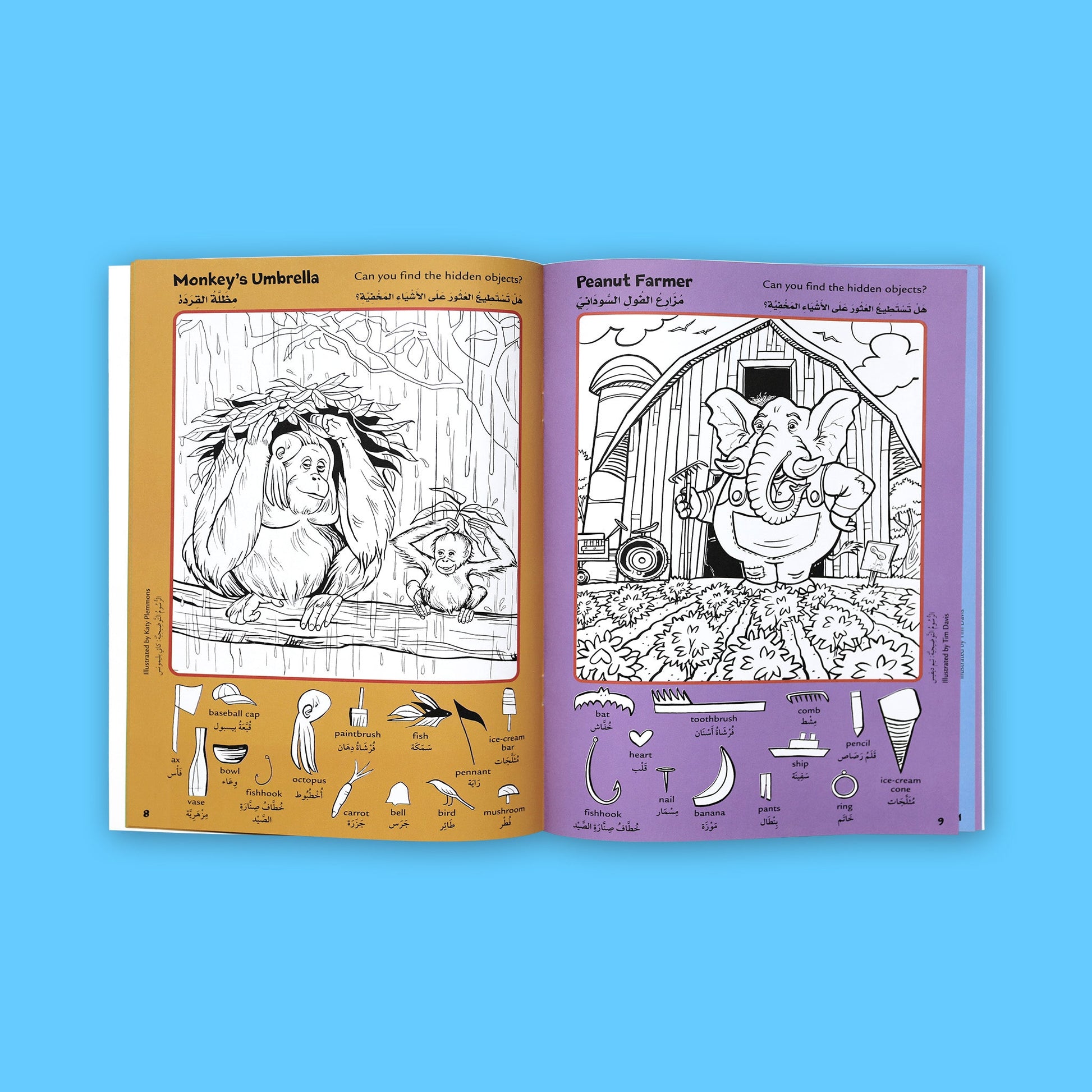 يبحث الطفل فيه عن صور مخفية في رسمة مفصّلة جاهزة للتلوين، تتواجد هذه الصور على طرف الكتاب باللغتين العربية والإنجليزية.