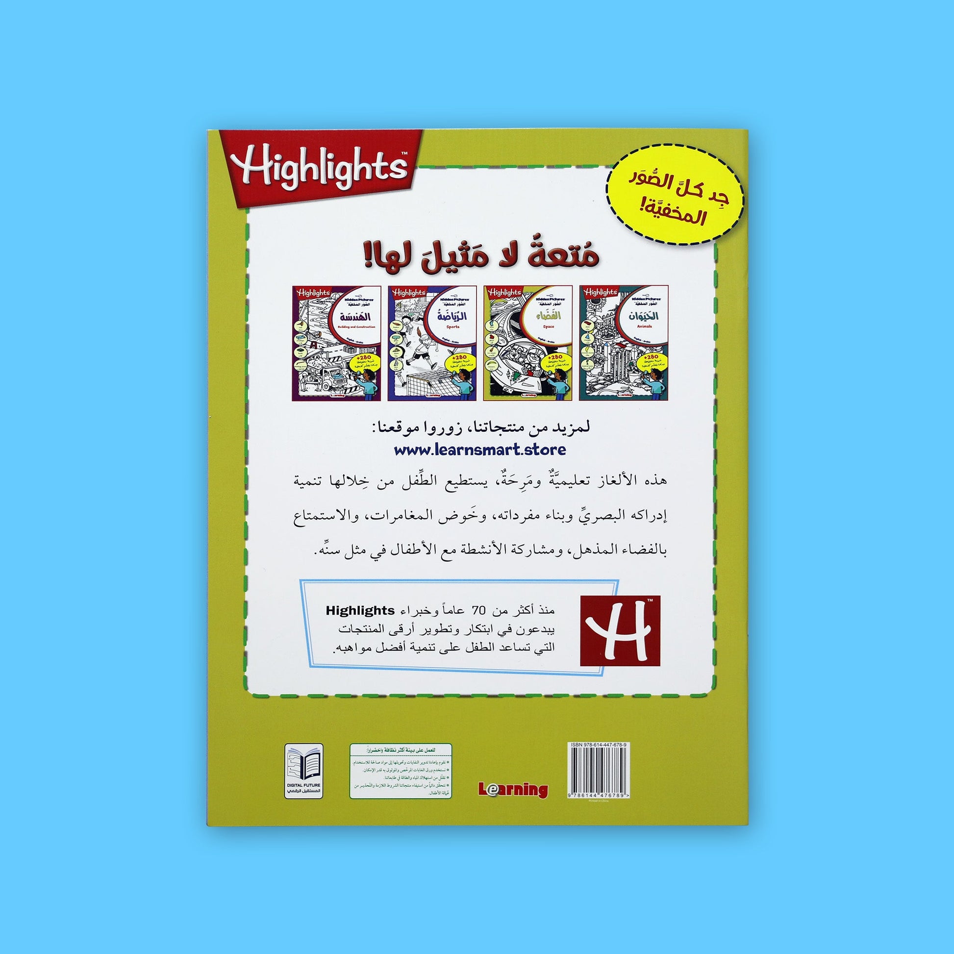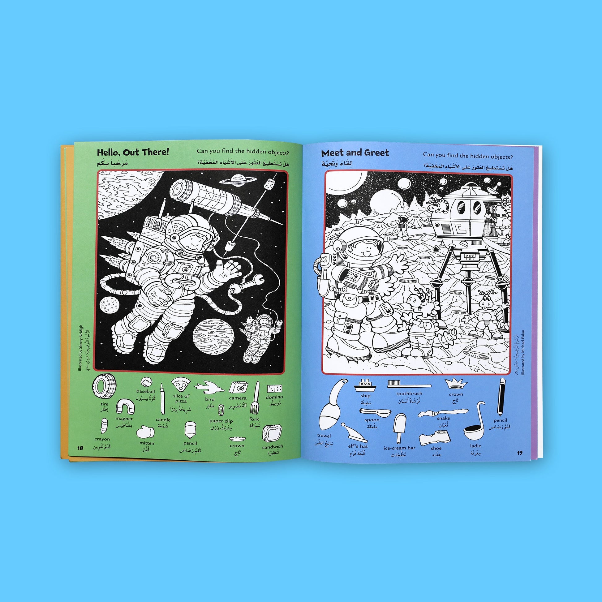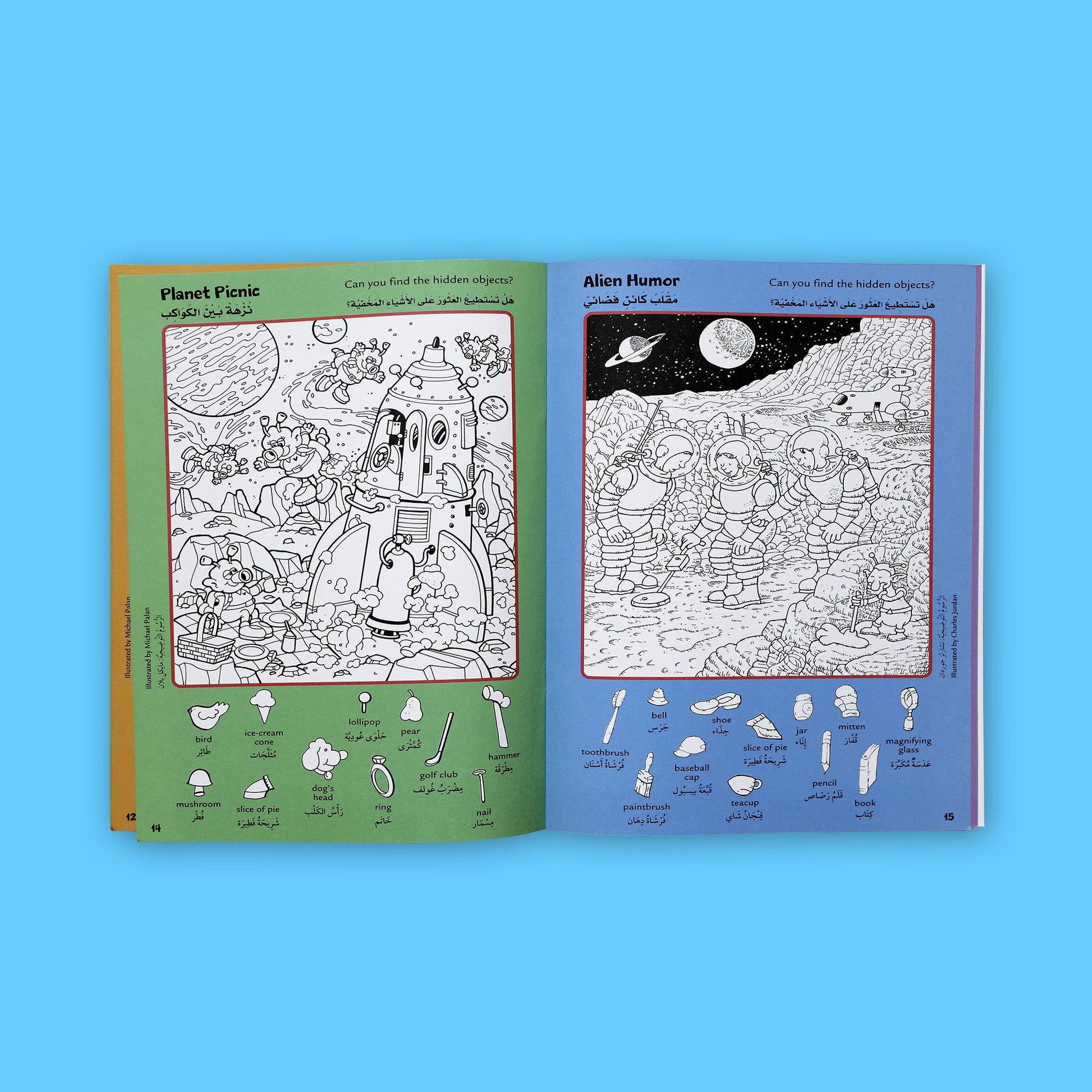 يبحث الطفل فيه عن صور مخفية في رسمة مفصّلة جاهزة للتلوين، تتواجد هذه الصور على طرف الكتاب باللغتين العربية والإنجليزية.