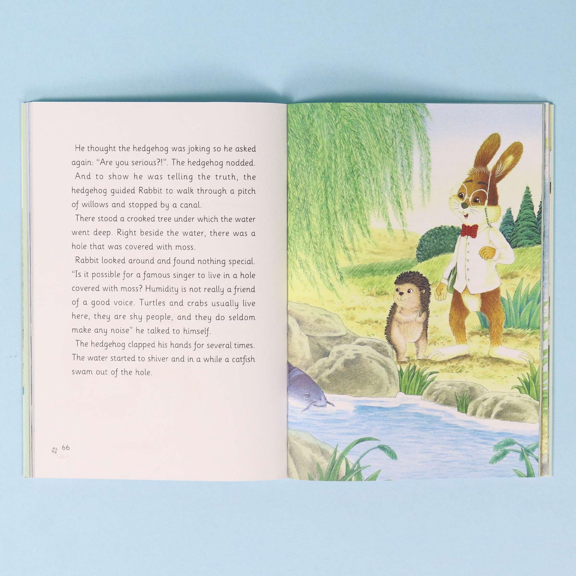 في أحد الأيام المشمسة في الغابة، التقى الأرنب الكاتب بفقمة البحر التي تحب أن تستلقي تحت أشعة الشمس كثيراً، فاستفاد كثيراً من هذا اللقاء، وبدأت نظرته للأمور تصبح أكثر تفتحاً. بعدها، قام بزيارة طائر البلشون الرمادي العجوز الوحيد الذي كان مولعاً بالتدخين، فاستخدم الأرنب حيلة رائعة لجعل هذا الطائر يترك تلك العادة السيئة. وعند الحفرة التي بجانبها جذع شجرة الصفصاف المائل، أُعجب الأرنب الكاتب بسمكة السلّور التي تغني وقرّر أن يعتبرها معلّمته، ثم أتى فصل الخريف، فحكى الأرنب الكاتب لصديقه الضفدع عن كل الأمور المحزنة التي بداخله، فنصحه الضفدع أن يستمتع بمشاهدة زهور المغنوليا وهي تتفتح عندما يأتي فصل الربيع. وبالفعل، وجد الأرنب نفسه قد تحسّن كثيراً وأصبح سعيداً، بل وأصبح أكثر تفاؤلاً ومرحاً. وفي ظل هذا التعايش مع أصدقائه، أصبح طريق حياة الأرنب الكاتب يزداد اتساعاً.