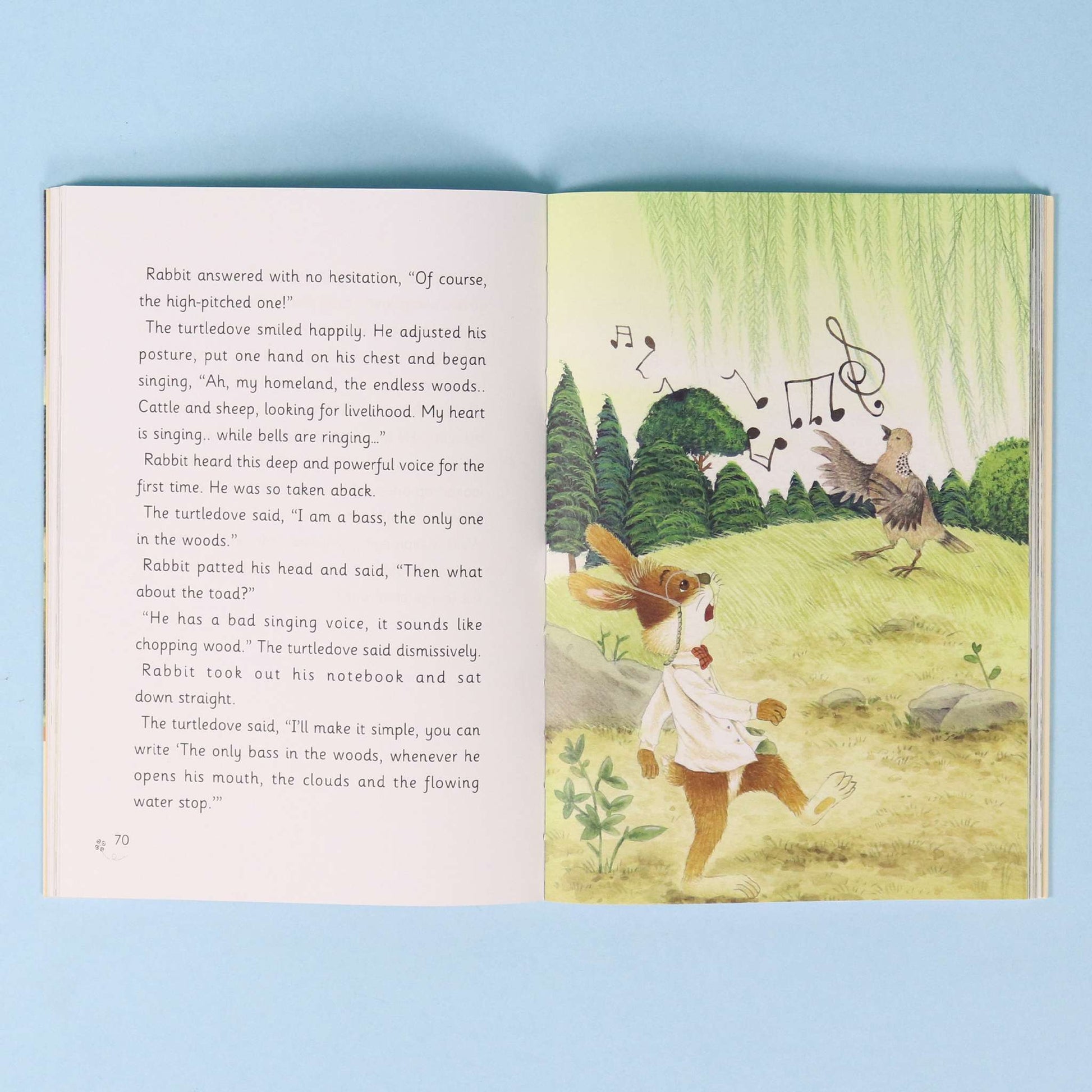 اعتقد الأرنب الكاتب أنه بمجرد أن يلبس نظارة سيبدو عليه أنه ذو معرفة وخبرة، وأنه يمكن أن يظهر بأنه صاحب حكمة بسيطة وحقيقية أمام الكاتب العجوز، فغيّر في مظهره وتأنّق، كما راوده حلم بأن يفتح في الغابة صفّاً للكاتب الصغير، فأنشأ صفّاً كتب فيه التلاميذ مقالات بكافة الأشكال والعديد من الكلمات، وكانت دروس الكتابة التي يعطيها لهم الكاتب العجوز مفيدة وهادفة، ثم بدأت المناقشة حول المقالات الجيّدة. بعد ذلك، أتى فصل الربيع، فتجوّل الأرنب الكاتب في الغابة ليبحث عن مطرب، فالتقى بالبلبل النبيل، والحمام المطوّق المغرور، والقنافذ التي تغني بنغمات هادئة، فأيّهم يا ترى يستطيع الغناء بطريقة جميلة تحرّك المشاعر؟